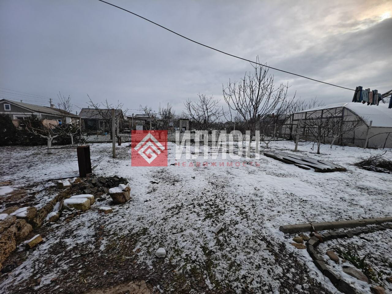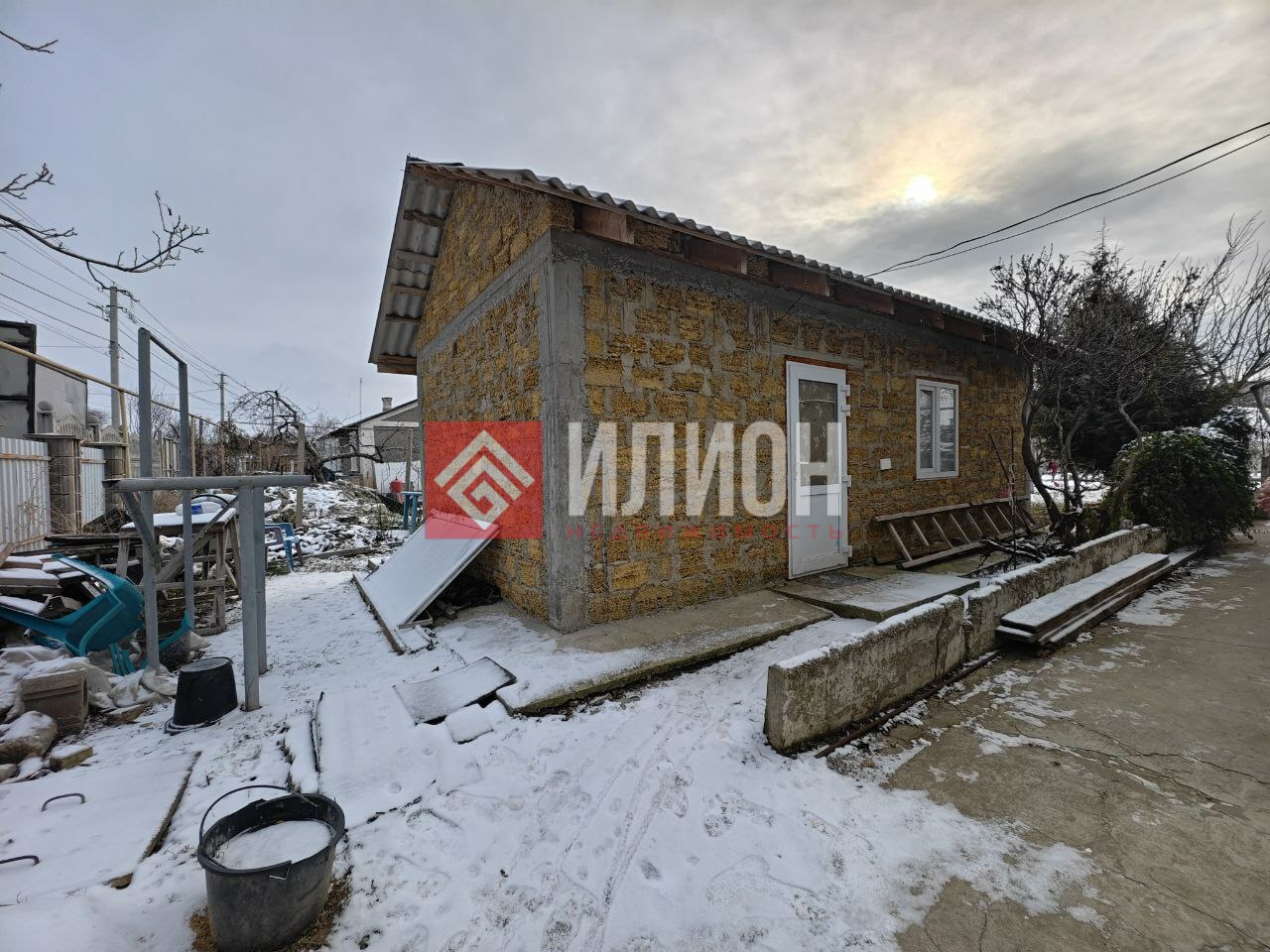 - На участке новая постройка 8×4 м: подведены свет и вода, внутри — штукатурка и стяжка; имеется сливная яма.