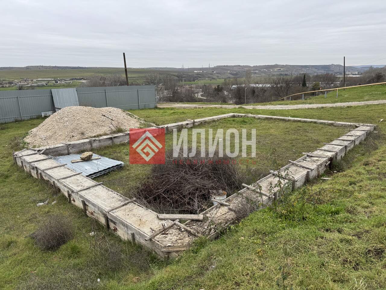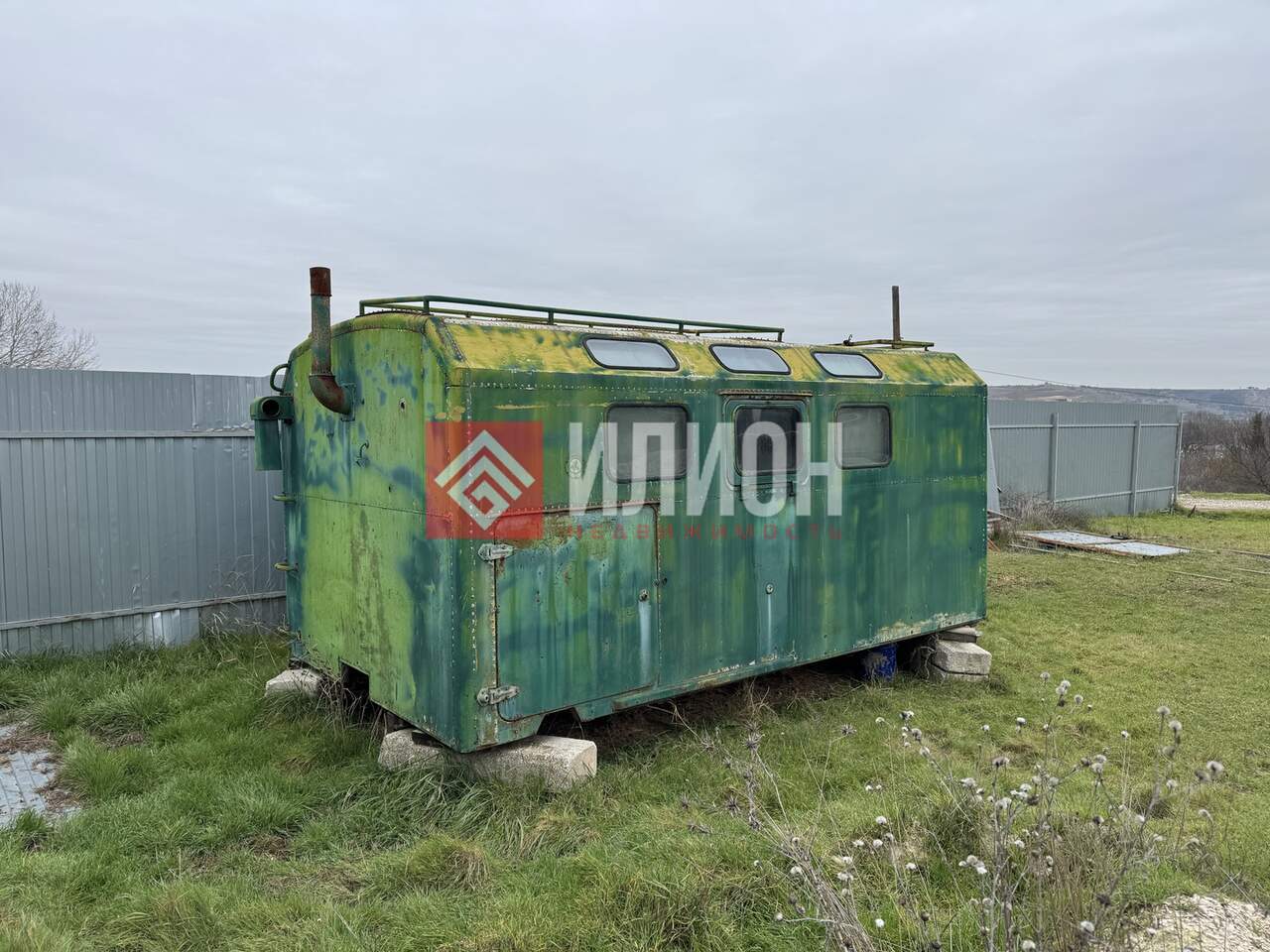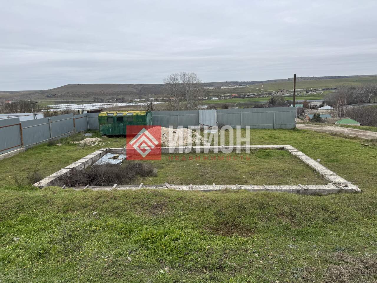 - На участке стоит железный вагончик и есть ленточный фундамент 6х10 (планировался под баню)