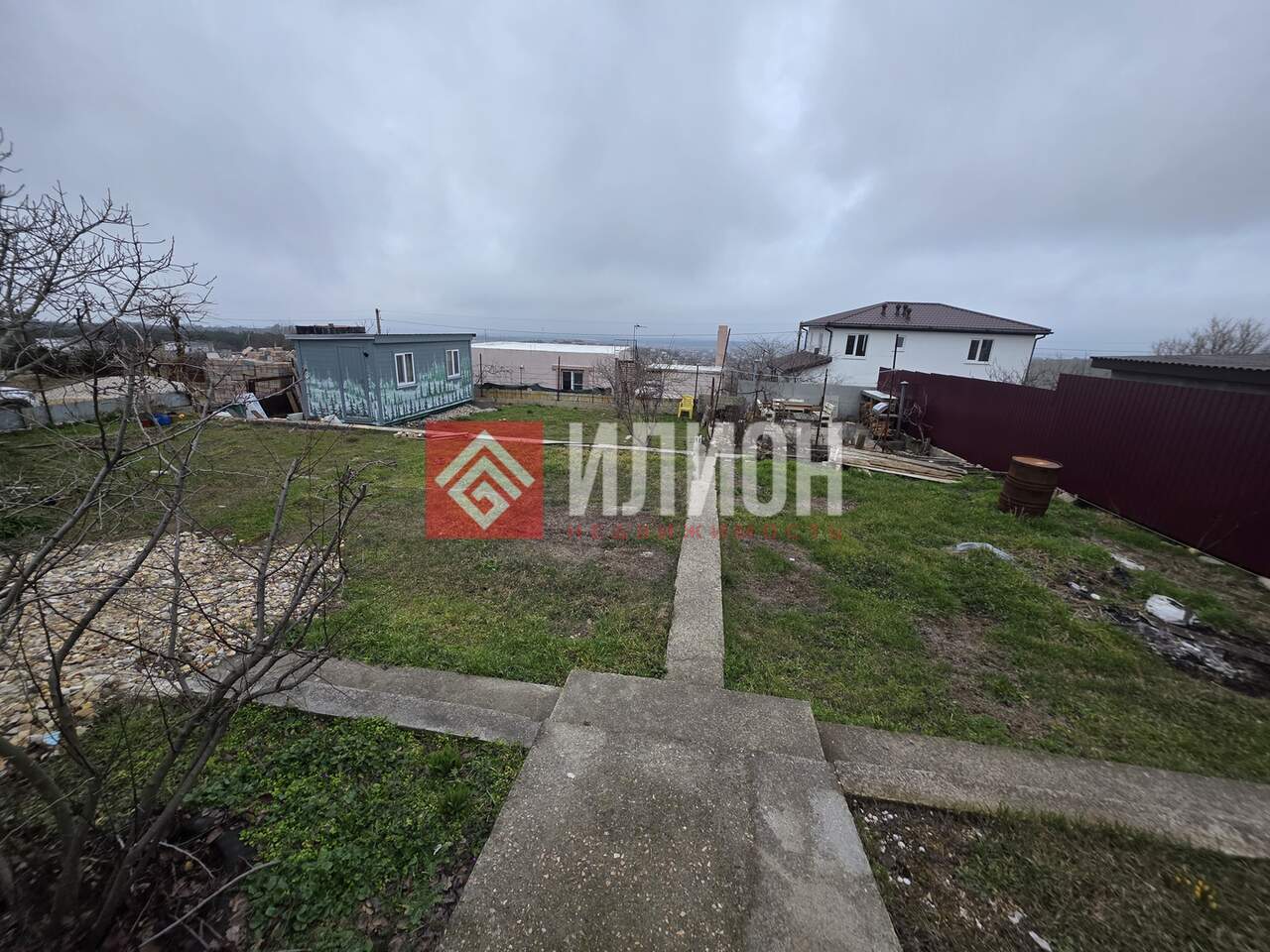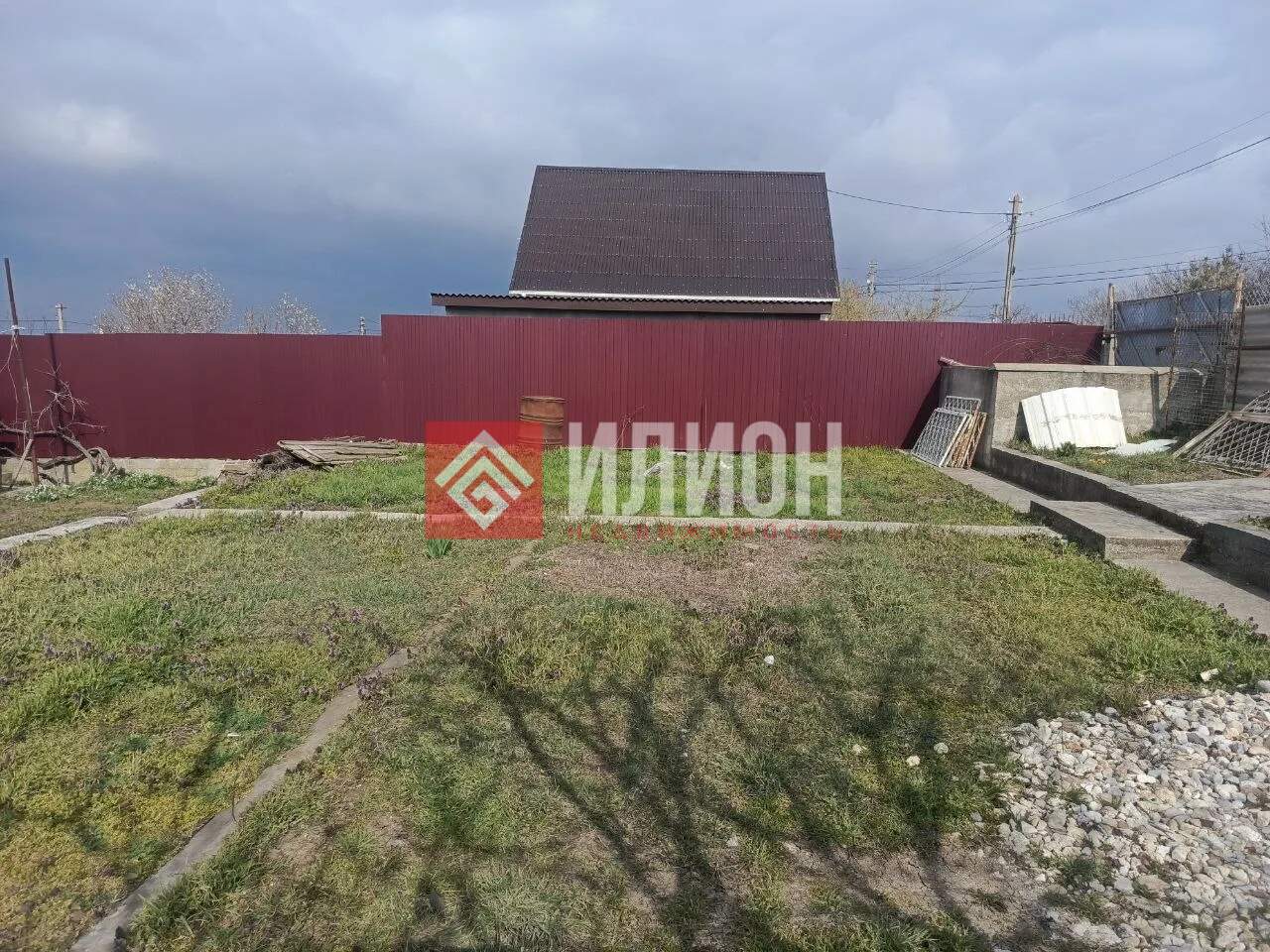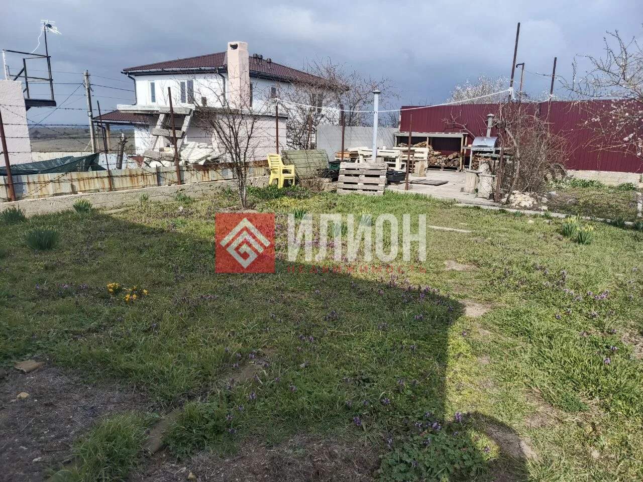 Участок огорожен забором и сделаны временные ворота для заезда техники. Растут плодовые деревья ( инжир, айва) и по периметру растёт вкусный виноград, много цветов.