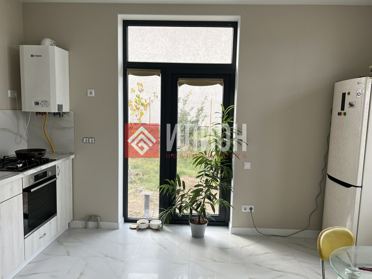 качественная керамическая плитка по всему дому, обои одинакового оттенка, пространство светлое и приятное.